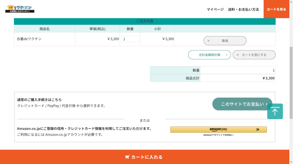 (支払方法は「クレジットカード」「PayPal」「代金引換」「amazon pay」から選択できます)