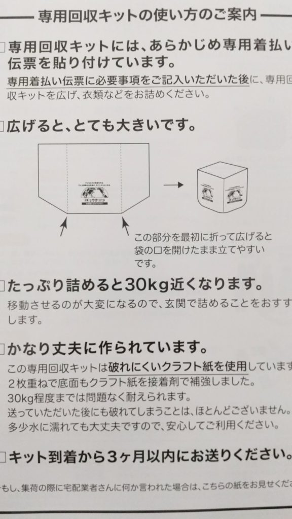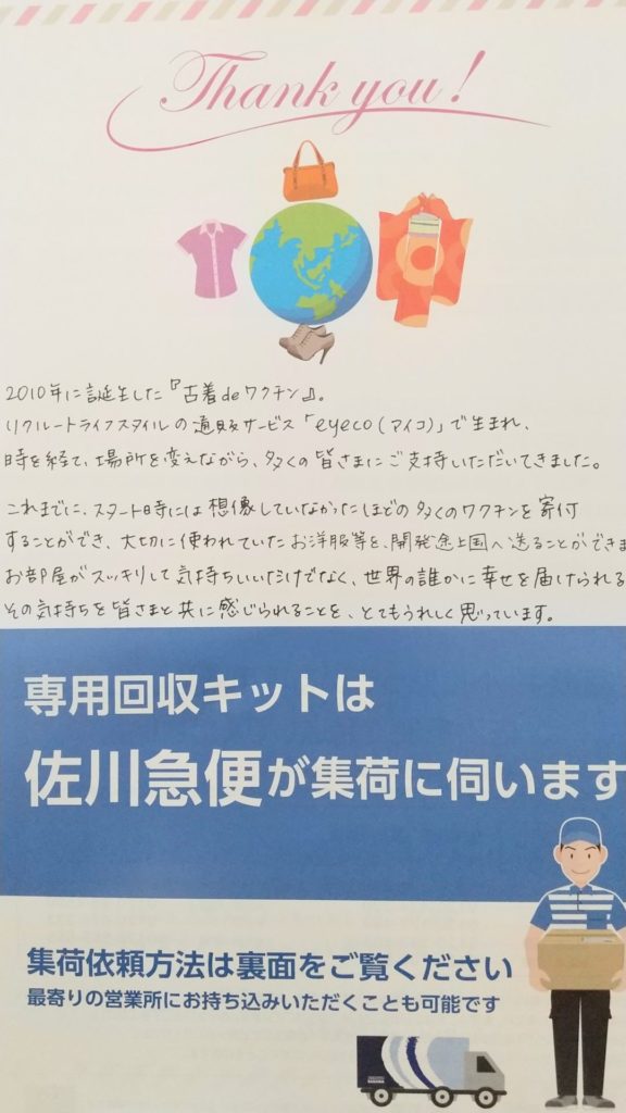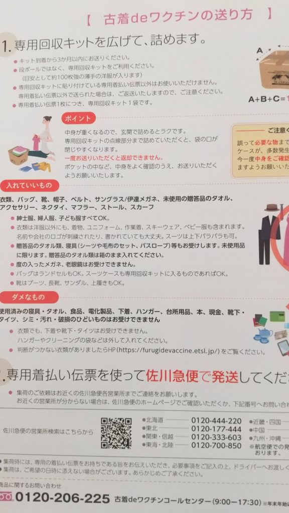 どうやら送付キットを購入して、そのキットに着なくなった洋服や履かなくなった靴などを入れて送るというものでした。